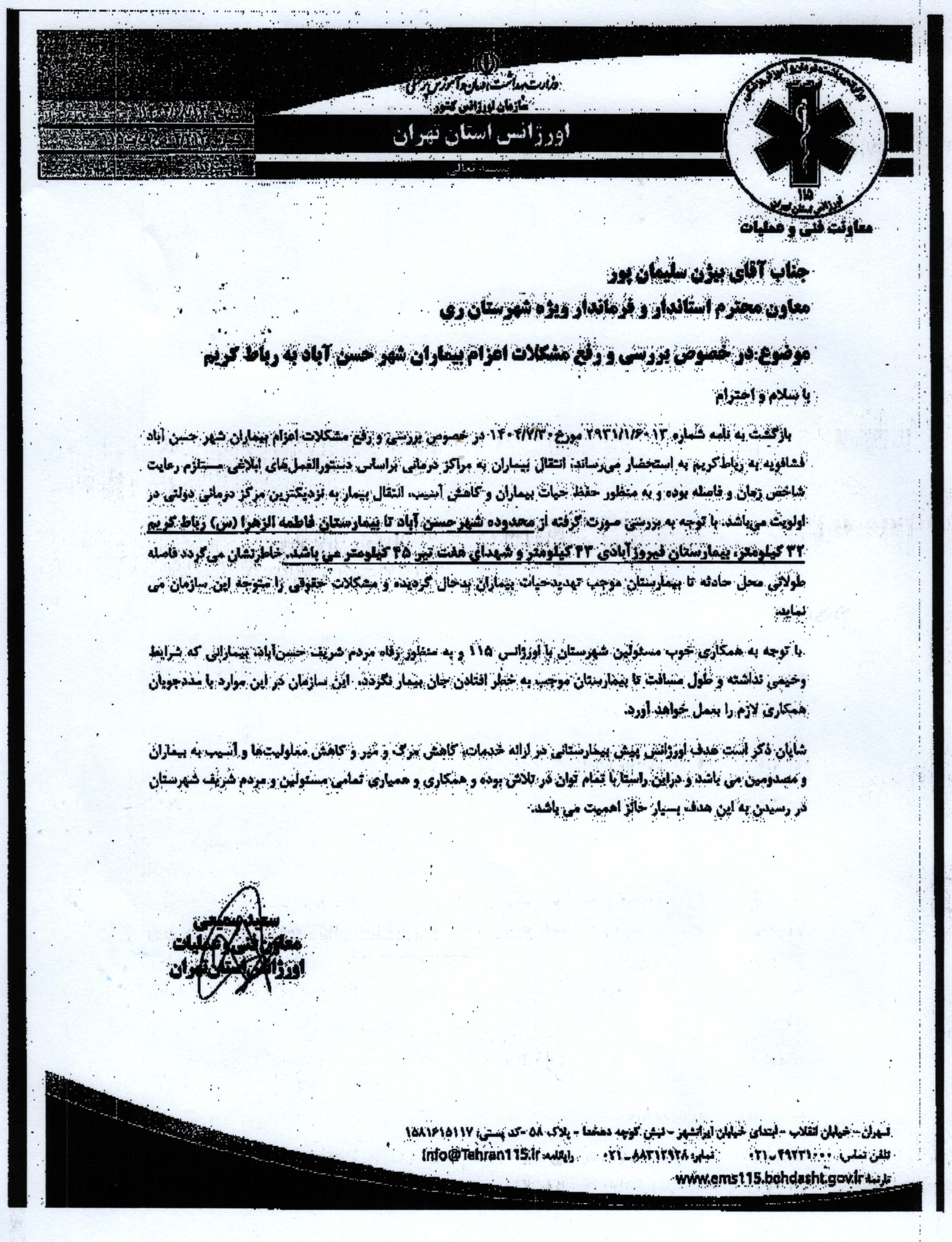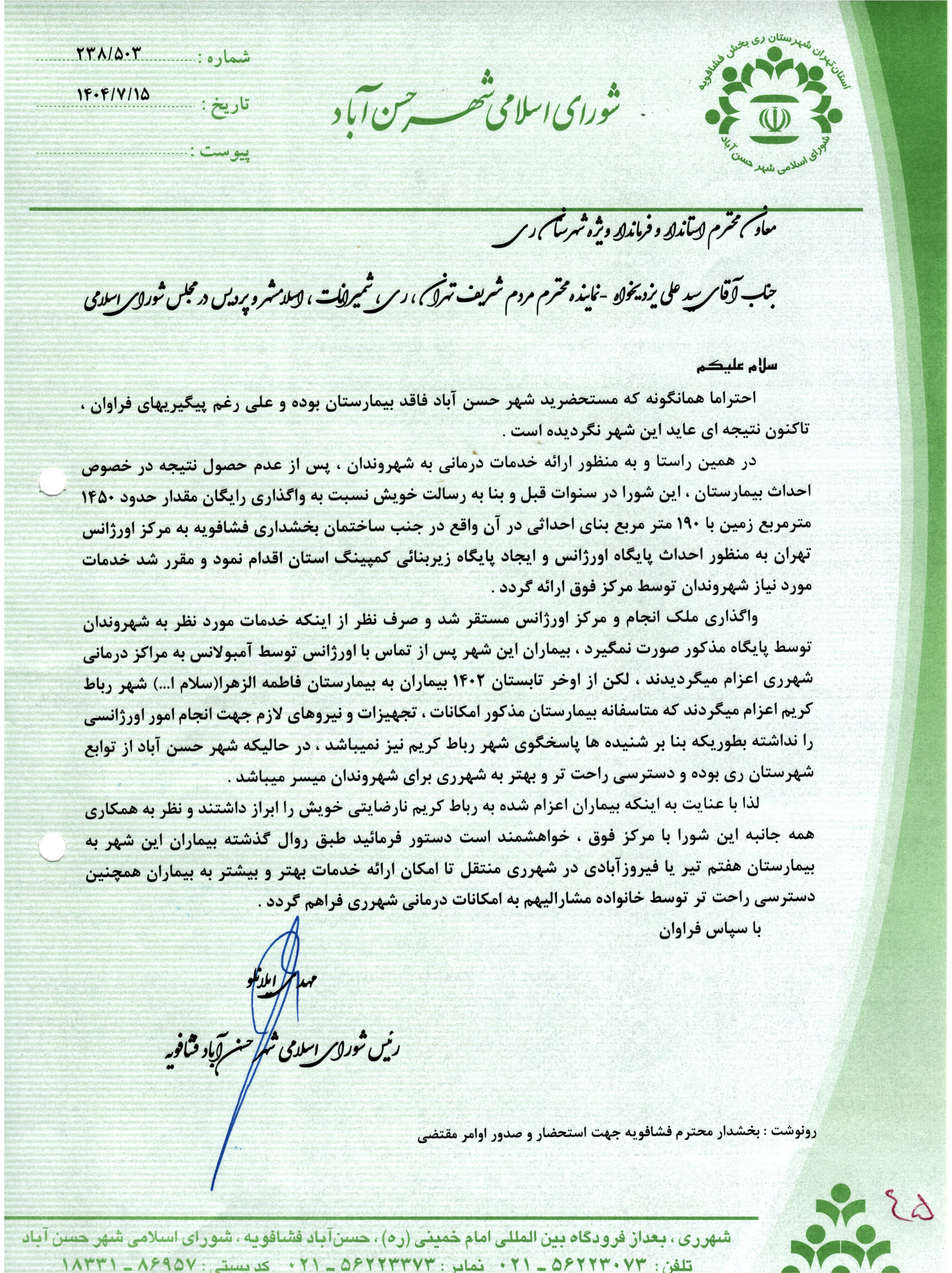 در پی اعتراض شهروندان محترم شهر حسن آباد در رابطه با اعزام بیماران توسط اورژانس حسن آباد به بیمارستان رباط کریم ، موضوع در دستور کار شورا قرار گرفت و طی مکاتباتی که با معاون محترم استاندار و فرماندار ویژه شهرستان ری صورت گرفت ، مراتب توسط آن مقام محترم به اورژانس تهران منعکس و پس از پیگیریهای بعمل آمده ، مدیریت محترم اورژانس تهران قول همکاری و مساعدت جهت اعزام آندسته از بیمارانی که حال وخیم ندارند به مراکز درمانی شهرری را صادر نمود.